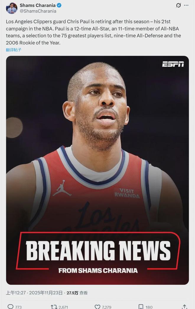 北京时间11月23日凌晨,NBA记者Shams报道,快船队后卫克里斯·保罗宣布将在本赛季结束后正式退役,结束21年的职业生涯。今天快船队和黄蜂队比赛。保罗回到北卡罗来纳州的家乡后说:“这是一次多么美妙的旅行啊。”我还有很多东西要学。我感谢这最后的旅程。” 保罗出生于 1985 年 5 月 6 日,身高 6 英尺 3 英寸,2005 年在首轮第四位被选中。在他 21 年的 NBA 职业生涯中,他 12 次入选全明星,11 次入选常规赛最佳阵容,9 次入选最佳防守阵容,6 次抢断领先,5 次助攻领先,并入选曾经的年度最佳新秀,保罗在 NBA 历史上的总助攻和总抢断排名第二,仅次于斯托克顿 保罗效力过七支球队。职业生涯效力过的球队类型:快船队(七个赛季)、黄蜂队(六个赛季)、太阳队(三个赛季)、火箭队(两个赛季)、雷霆队(一个赛季)、勇士队(一个赛季)和马刺队(一个赛季)。保罗进入NBA的那一年,他的教练还在读高中。当时我经常在杂志上看到关于这位新球员的新闻。保罗赢得了所有西部联盟月度最佳新秀奖。新秀赛季,保罗场均贡献16.1分、5.1个篮板、7.8次助攻、2.2次抢断和2.4次失误,三分命中率分别为43%、28.2%和84.7%。在年度最佳新秀评选中,保罗仅差一票就获得了全部选票。此后,围绕保罗的新闻故事和笑话层出不穷,包括“58年”、“篮球的理由”、“西部决赛地板”、“大炮吹响警告”……2009年4人组季后赛首轮,黄蜂队主场63-121不敌掘金队。单场58分的差距创造了季后赛历史纪录!今年7月,保罗在节目中宣布2025-26赛季将是他在NBA的最后一支舞,他将于2026年夏天正式退役。加盟快船后,保罗再次改变主意,表示“我还想继续打球,不知道什么时候退役”。 “我还没有决定,”他说。常规赛才刚刚开始,保罗为何就决定退役呢?本赛季看过快船比赛的球迷应该有心理准备:保罗确实没多少气了。本赛季到目前为止,保罗已经为快船队出战了10场比赛,全部都是替补出场。场均上场13.7分钟,得到2.5分1.8篮板3.3助攻1抢断1.1失误。三分球命中率分别为27.3%、27.3%和100%。顺便说一句,保罗上赛季为马刺队出战了82场常规赛,而且全部都是首发。场均出战28分钟,得到8.8分3.6篮板7.4助攻1.3抢断1.6失误。 37.7%和92.4% 仅仅一年之后,保罗的数据就直线下降,是时候说再见了。保罗总共打了 1,364 场常规赛伊森职业生涯共出场 1,314 场比赛,其中先发 1,314 场。场均贡献16.9分4.4篮板9.2助攻2抢断,投篮命中率46.9%、36.9%。三分命中率87.1%,季后赛出战149场,场均贡献20分4.9篮板8.3助攻1.9抢断。命中率:48.4%、37.3%、85.4%。